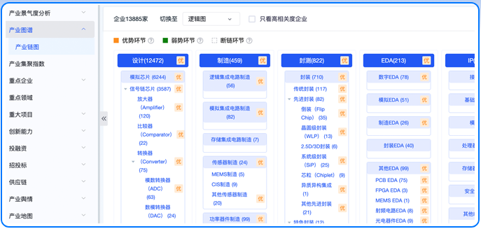 在摸清产业现状的基础上,产业大脑进一步提供诊断与分析功能,帮助识别区域产业发展的优势与短板。平台通过产业链图谱与竞争力模型,明确产业环节中的“断点”“弱点”与“优势点”,进而规划出“补链、强链、延链”的具体路径: