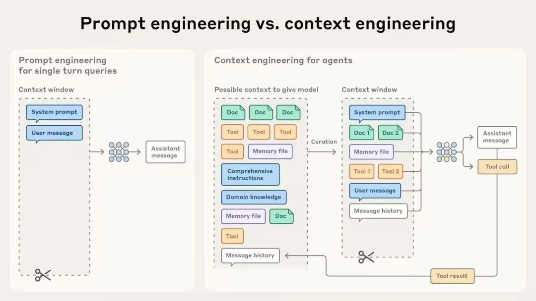 传统的提示工程聚焦于静态提示设计,而上下文工程则要求动态管理整个上下文,包括系统提示、工具、消息历史、外部数据和运行时信号。这种全面的视角让代理在多轮推理中更灵活、更高效。