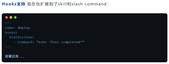 之前hooks只能在agent层面定义,现在skill级别也能定义了。这意味着你可以为每个skill设置独立的前置检查、后置处理逻辑。现在,agent、skill、slash command三个层级都能单独定义Hooks了。想控制哪层就控制哪层。