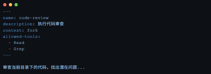 设置了context: fork之后,这个skill的执行会fork出一个子代理,有自己独立的上下文,不会污染主对话。适合那种需要大量读取文件、执行复杂分析的场景。