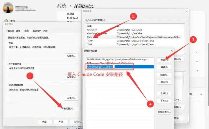 可通过以下步骤添加:打开系统属性 → 环境变量 → 编辑用户 PATH → 新建 → 添加上方的 Claude 安装路径。