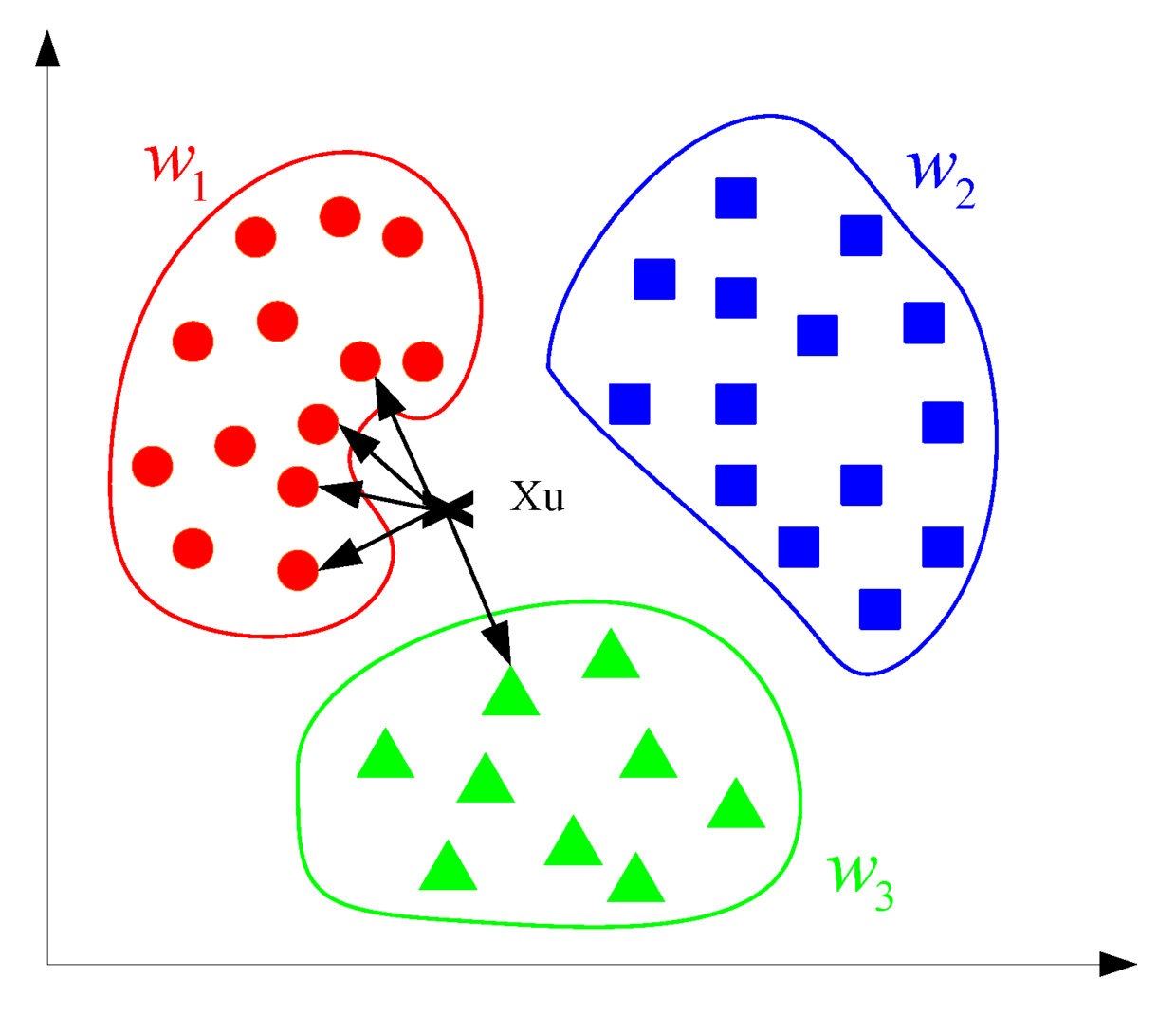 对于待判断的点,找到离它最近的几个数据点,根据它们的类型决定待判断点的类型。