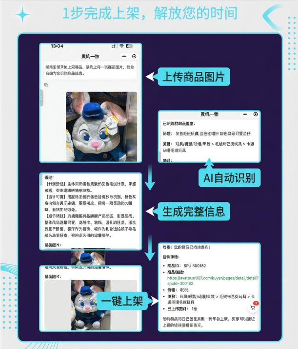 上架商品不再是挨个填信息、选类目的一整套流程,而是可以从一张商品照片开始:系统自动识别商品类型、核心卖点和适合的展示方式,生成清晰可理解的商品描述。