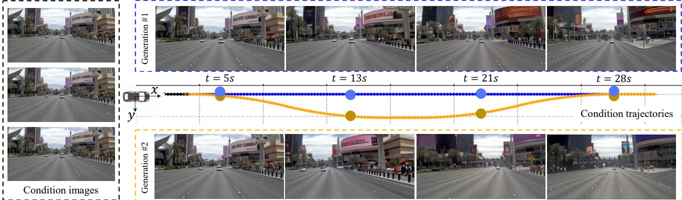 Figure 1. Controllable generation results of our method. Our method takes a short video clip as input and can generate multiple possible future driving scenarios conditioned on different pre-defined trajectory paths. We use one straightforward path and one curved path as examples, and the results show that our method achieves accurate control and future prediction.