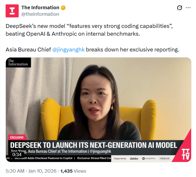 今早5点30,Theinformation消息,全球著名开源平台DeepSeek计划于2026年2月中旬、农历新年前后开源V4大模型。