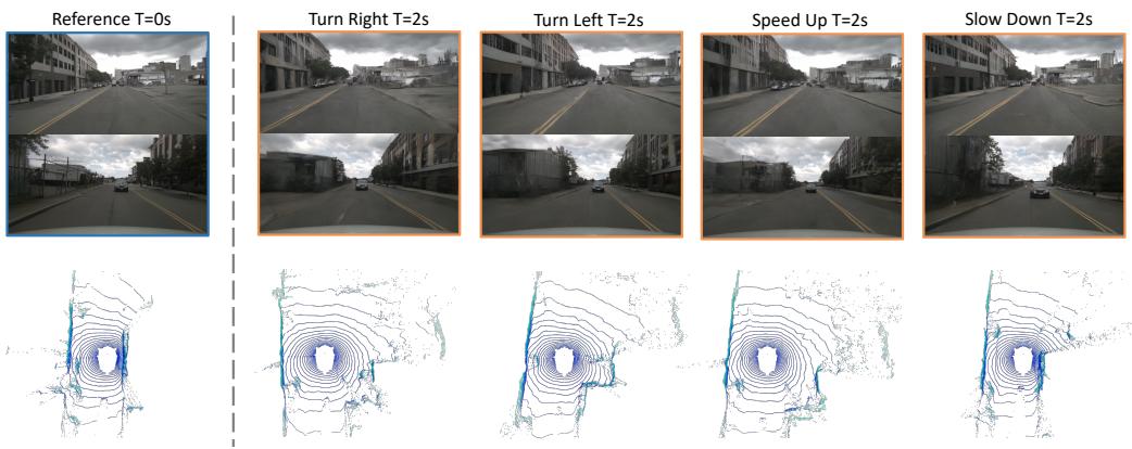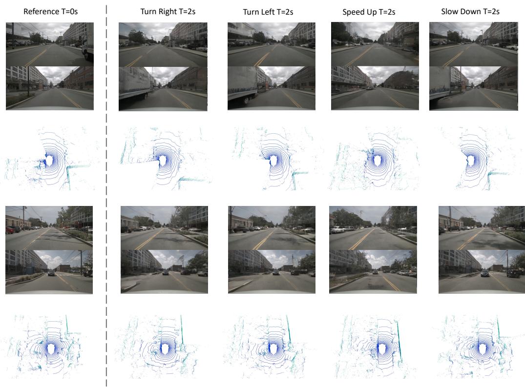 Controllability. We present more visual results of controllability in Figure 11. The generated images and Lidar exhibit a high degree of consistency with action, which demonstrates that our world model has the potential of being a simulator.