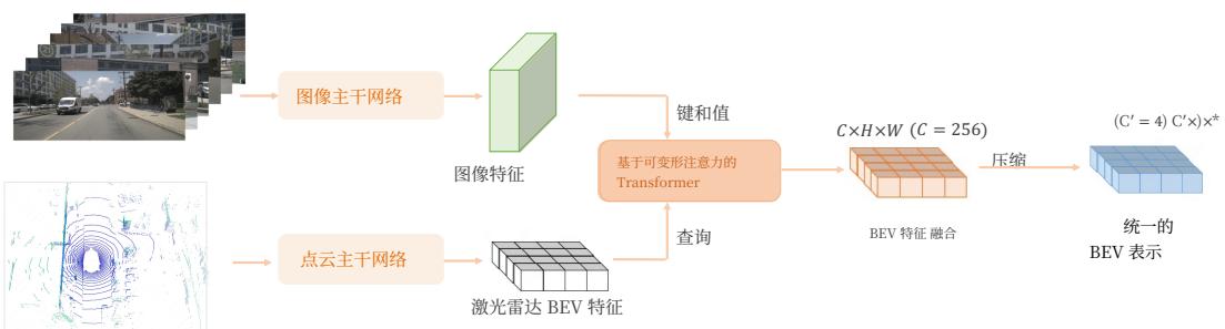 图 2:BEV 编码器的详细结构。编码器将多视角多模态传感器数据作为输入。多模态信息通过可变形注意力进行融合,BEV 特征被通道压缩以与扩散模型兼容。