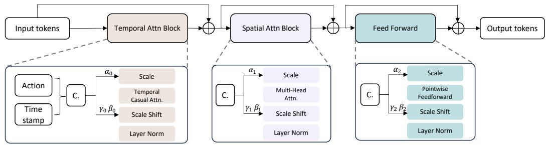 The denoising process is carried out with a spatial-temporal transformer containing a sequence of transformer blocks, the architecture of which is shown in the Figure 4. The input of spatial(x‾t−P,⋅⋅⋅,x‾t−1,x‾t,x‾t+1ϵ,⋅⋅⋅,x‾t+Nϵ)\left( \overline { { x } } _ { t - P } , \cdot \cdot \cdot , \overline { { x } } _ { t - 1 } , \overline { { x } } _ { t } , \overline { { x } } _ { t + 1 } ^ { \epsilon } , \cdot \cdot \cdot , \overline { { x } } _ { t + N } ^ { \epsilon } \right)(xt−P,⋅⋅⋅,xt−1,xt,xt+1ϵ,⋅⋅⋅,xt+Nϵ) nation of condition BEV tokens and noisy B. These tokens are modulated with action tokens {ai}i=T−PT+N\{ a _ { i } \} _ { i = T - P } ^ { T + N }{ai}i=T−PT+N More specifically, the input tokens are first passed to temporal attention block for enhancing temporal smoothness. To avoid time confusion problem, we added the causal mask into temporal attention. Then, the output of temporal attention block are sent to spatial attention block for accurate details. The design of spatial attention block foAction token and diffusion timestamp {t^id}i=T−PT+N\{ \hat { t } _ { i } ^ { d } \} _ { i = T - P } ^ { T + N }{t^id}i=T−PT+N ard transformer block criterion Luare concatenated as the condition {ci}i=T−PT+N\{ c _ { i } \} _ { i = T - P } ^ { T + N }{ci}i=T−PT+N a).of diffusion models and then sent to AdaLN Peebles & Xie (2023) (6) to modulate the token features.