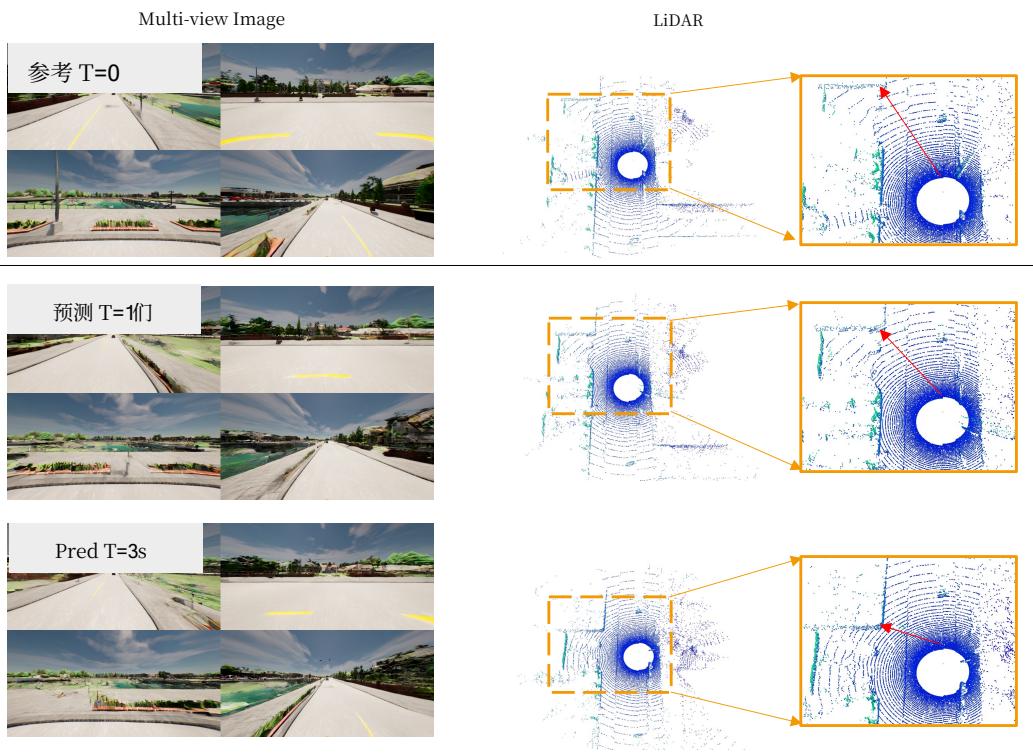 众所周知,推理扩散模型通常需要约 50 步才能达到去噪效果,这是一个缓慢且计算开销大的过程。不幸的是,我们也面临类似挑战。作为构建多模态世界模型探索的先驱者,我们的主要关注点在于驾驶场景下的生成质量,优先于计算开销。鉴于效率的重要性,我们认为在所提方法中采用一步扩散是未来改进的关键方向。关于生成图像的质量,我们注意到图像中的动态物体有时会出现模糊。为了解决这一问题并进一步提升其清晰度与一致性,未来可能需要专门针对动态物体的模块。