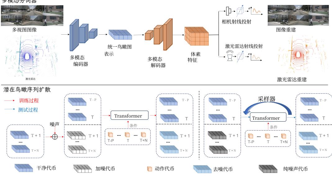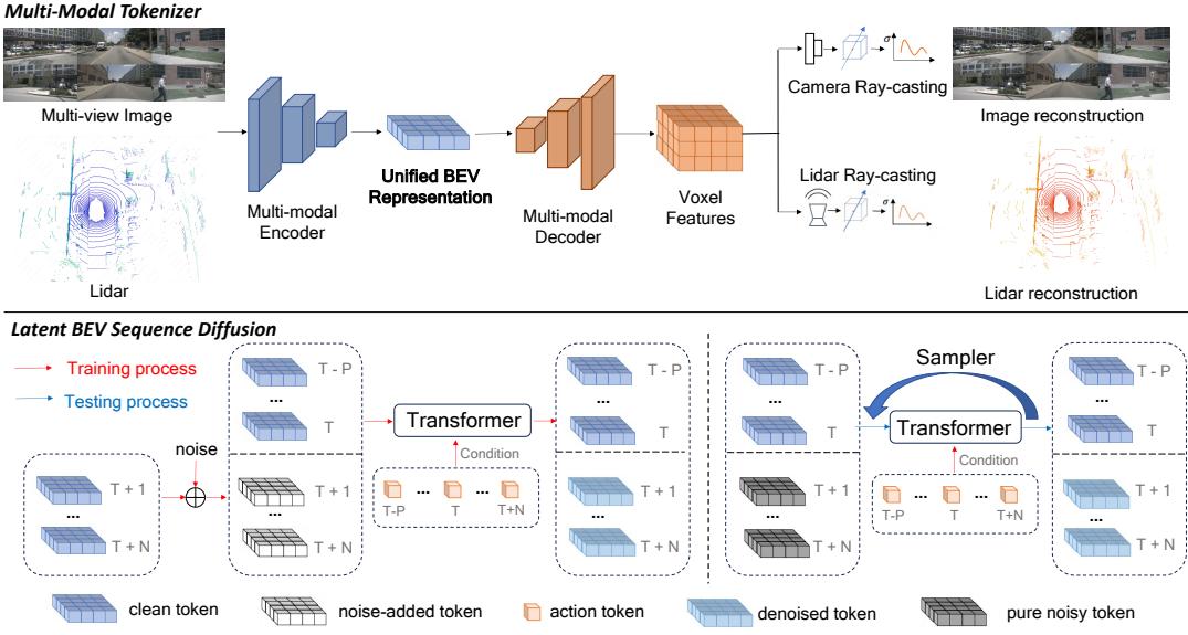 • We propose a novel multi-modal tokenizer that unifies visual semantics and 3D geometry into a BEV representation. By leveraging a rendering-based reconstruction method, we ensure high BEV quality and validate its effectiveness through ablations, visualizations, and downstream tasks. • We design a latent diffusion-based world model that enables synchronized generation of multi-view images and point clouds. Extensive experiments on the nuScenes and Carla datasets demonstrate our model’s superior performance in multi-modal future prediction.