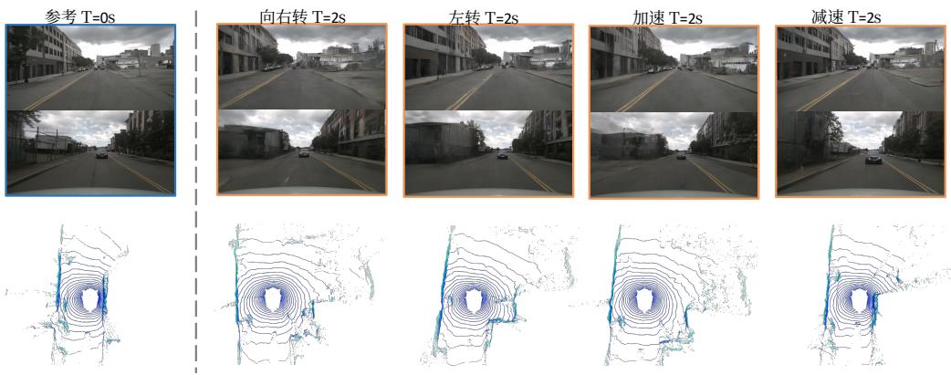 ,使其难以用大量未标注数据进行训练。因此我们不将人工注释放作为模型条件。结果如表 4 所示。所提出的方法在不使用人工标注条件的方法中取得了最佳的 FID 和 FVD 性能,并在使用额外条件的方法中表现出可比的结果。激光雷达和视频预测的可视化结果如图5所示。此外,生成过程可由动作条件进行控制。我们将动作代币转换为左转、右转、加速和减速,生成的图像和激光雷达数据可根据这些指令生成。可控性的可视化如图6所示。