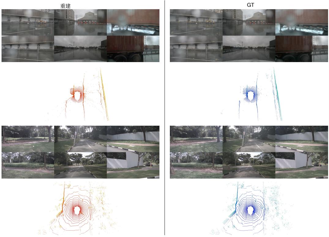 图7:在 nuScenes 数据集上激光雷达和视频重建的可视化。