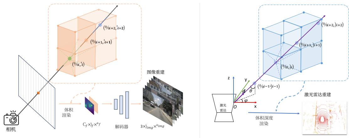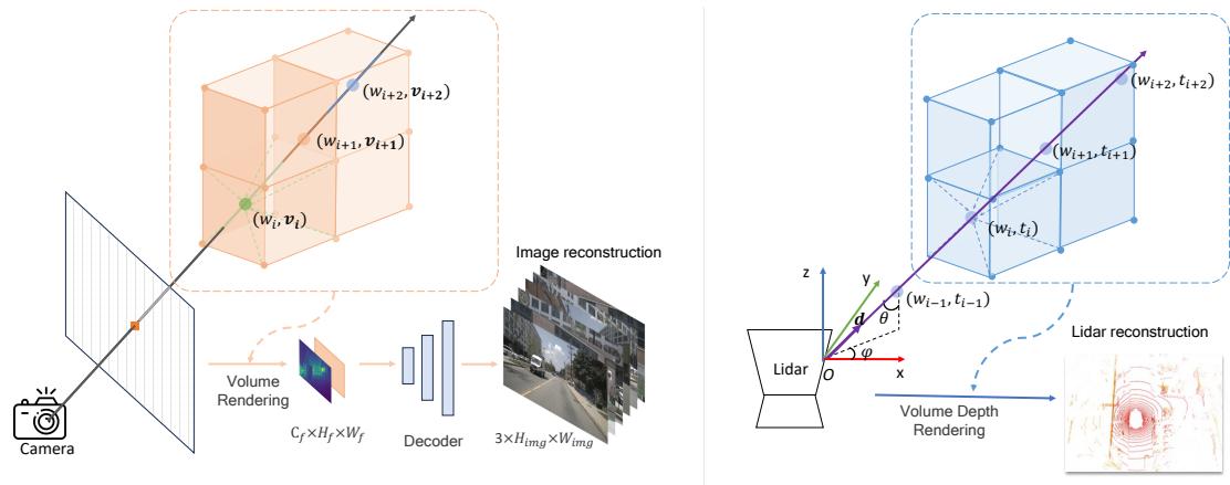 The multi-modal rendering network can be elegantly segmented into two distinct components, image reconstruction network and Lidar reconstruction network. For image reconstruction network, we first get the ray r(t)=o+td\mathbf { r } ( t ) = \mathbf { o } + t \mathbf { d }r(t)=o+td , which shooting from the camera center o to the pixel center in direction d\mathbf { d }d Then we uniformly sample a set of points {(xi,yi,zi)}i=1Nr\{ ( x _ { i } , y _ { i } , z _ { i } ) \} _ { i = 1 } ^ { N _ { r } }{(xi,yi,zi)}i=1Nr along the ray, where Nr(Nr=150)N _ { r } ( N _ { r } = 1 5 0 )Nr(Nr=150) is the total number of points sampled along a ray. Given a sampled point (xi,yi,zi)( x _ { i } , y _ { i } , z _ { i } )(xi,yi,zi) , the corresponding features vi\mathbf { v } _ { i }vi are obtained from the voxel feature according to its position. Then, all the sampled features in a ray are aggregated as pixel-wise feature descriptor (Eq. 1).