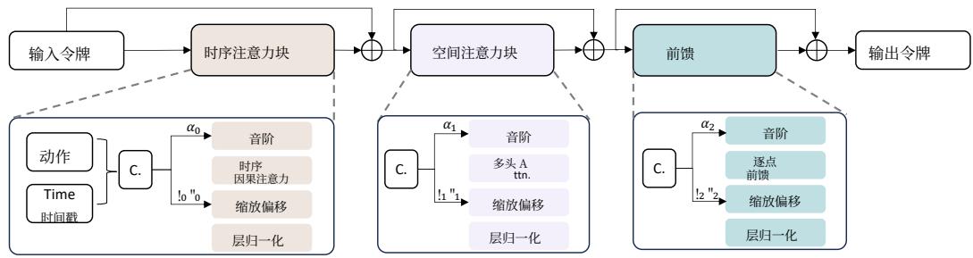 NuScenes Caesar et al. (2020) NuScenes is a widely used autonomous driving dataset, whichcomprises multi-modal data such as multi-view images from 6 cameras and Lidar scans. It includes a(x‾t−P,⋅⋅⋅,xt−1ˉ,xtˉ)( \overline { { x } } _ { t - P } , \cdot \cdot \cdot , \bar { x _ { t - 1 } } , \bar { x _ { t } } )(xt−P,⋅⋅⋅,xt−1ˉ,xtˉ) 作为条件令牌,而 (xt+1,⋅⋅⋅,xt+N)( x _ { t + 1 } , \cdot \cdot \cdot , x _ { t + N } )(xt+1,⋅⋅⋅,xt+N) 被扩散为带噪 BEV 令牌(xt+1ϵ,⋅⋅⋅,xt+Nϵ)( x _ { t + 1 } ^ { \epsilon } , \cdot \cdot \cdot , x _ { t + N } ^ { \epsilon } )(xt+1ϵ,⋅⋅⋅,xt+Nϵ) ,噪声为 {ϵt^i}i=t+1t+N\{ \epsilon _ { \hat { t } } ^ { i } \} _ { i = t + 1 } ^ { t + N }{ϵt^i}i=t+1t+N ,其中 ρ^t\mathbf { \hat { \rho } } _ { t }ρ^t 是扩散过程的时间戳。去噪过程由一个时空Transformer 执行,该 Transformer 包含一系列 Transformer 块,其结构见图4。时空Transformer 的输入是条件 BEV 令牌与带噪 BEV 令牌的拼接(x‾t−P,⋅⋅⋅,xt−1,xt,xt+1ϵ,⋅⋅⋅,xt+Nϵ)0( \underline { { x } } _ { t - P } , \cdot \cdot \cdot , x _ { t - 1 } , x _ { t } , x _ { t + 1 } ^ { \epsilon } , \cdot \cdot \cdot , x _ { t + N } ^ { \epsilon } ) _ { 0 }(xt−P,⋅⋅⋅,xt−1,xt,xt+1ϵ,⋅⋅⋅,xt+Nϵ)0 这些令牌由表示车辆运动和转向的动作令牌 {ai}i=T−PT+N\{ a _ { i } \} _ { i = T - P } ^ { T + N }{ai}i=T−PT+N 进行调制,共同构成时空 Transformer 的输入。更具体地,输入令牌首先被送入时间注意力块以增强时序平滑性。为避免时间混淆问题,我们在时间注意力中加入了因果掩码。随后,时间注意力块的输出被送入空间注意力块以获得精确细节。空间注意力块的设计遵循标准Transformer 块的准则 Lu et al. (2023a)。动作代币与扩散时间戳 {t^id}i=T−PT+N\{ \hat { t } _ { i } ^ { d } \} _ { i = T - P } ^ { T + N }{t^id}i=T−PT+N 被串联作为扩散模型的条件 {ci}i=T−PT+N\{ c _ { i } \} _ { i = T - P } ^ { T + N }{ci}i=T−PT+N ,然后送入 AdaLN Peebles & Xie (2023) (6) 以调节令牌特征。