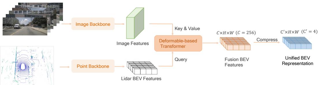 Figure 2: The detailed structure of BEV encoder. The encoder takes as input the multi-view multimodality sensor data. Multimodal information is fused using deformable attention, BEV features are channel-compressed to be compatible with the diffusion models.