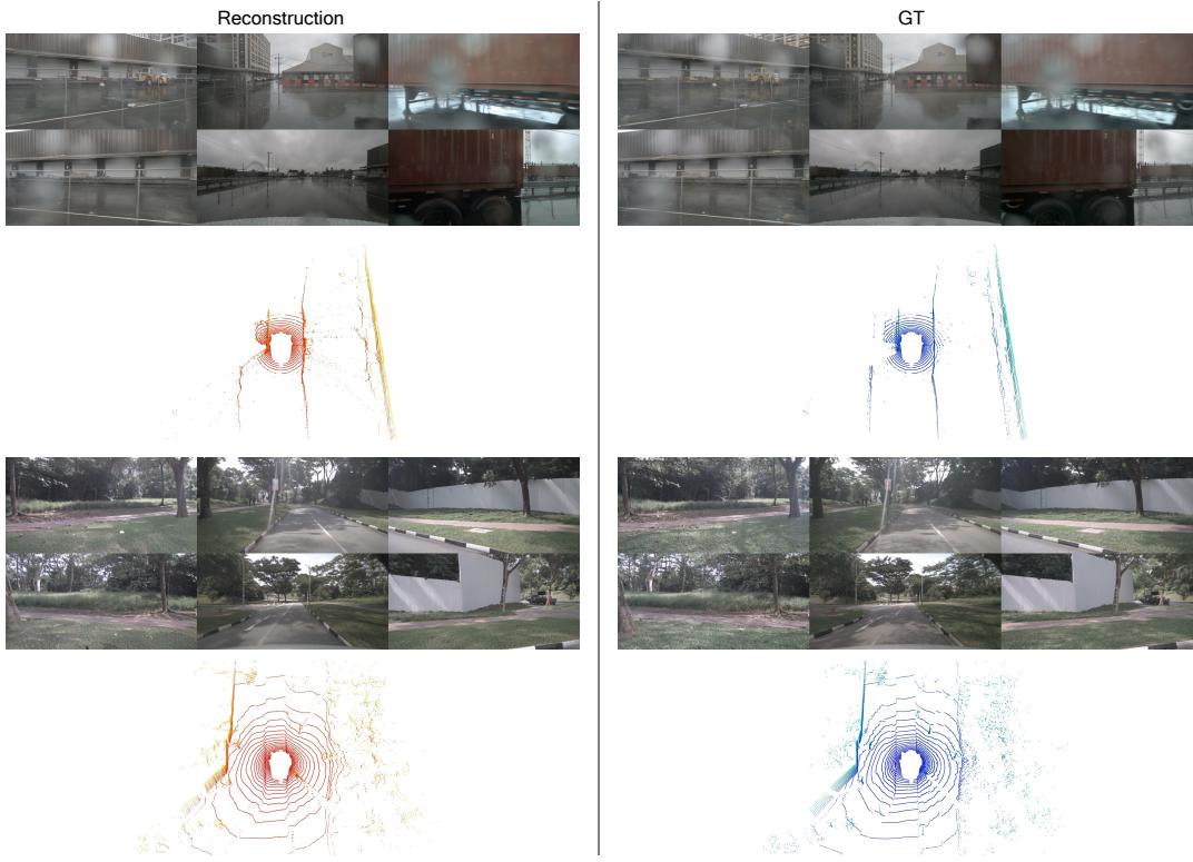 Figure 7: The visualization of LiDAR and video reconstructions on nuScenes dataset.