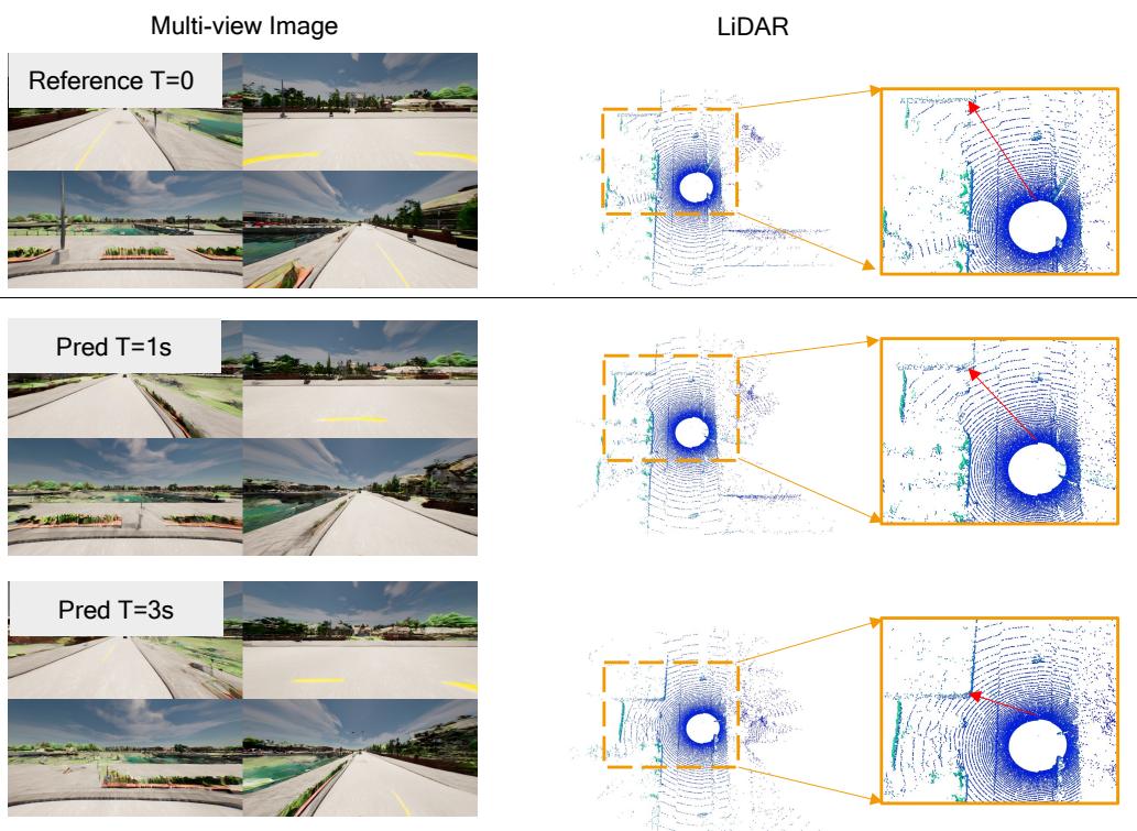 It is widely acknowledged that inferring diffusion models typically demands around 50 steps to attain denoising results, a process characterized by its sluggishness and computational expense. Regrettably, we encounter similar challenges. As pioneers in the exploration of constructing a multi-modal world model, our primary emphasis lies on the generation quality within driving scenes, prioritizing it over computational overhead. Recognizing the significance of efficiency, we identify the adoption of onestep diffusion as a crucial direction for future improvement in the proposed method. Regarding the quality of the generated imagery, we have noticed that dynamic objects within the images sometimes suffer from blurriness. To address this and further improve their clarity and consistency, a dedicated module specifically tailored for dynamic objects may be necessary in the future.