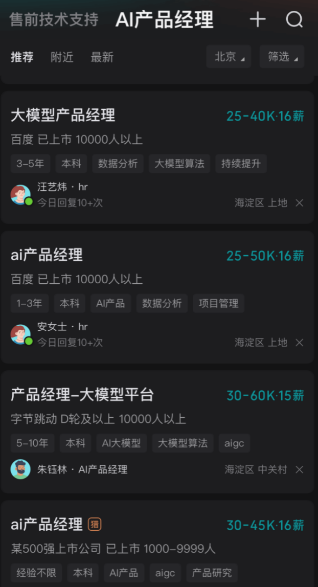 那接下来,只能从产品类挑选。传统的产品岗位也有很多细分,有不同功能模块的产品经理(计算机视觉、语音识别、平台、对话系统、数据分析等等)、交互设计产品经理(UI)、用户体验产品经理(UX)、解决方案产品经理(SA)等等。随着chatgpt等大模型爆火,还有一类产品经理,即prompter,提示词工程师的岗位也越来越多。