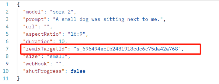 添加 remixTargetId 参数,填入原始视频的 ID
