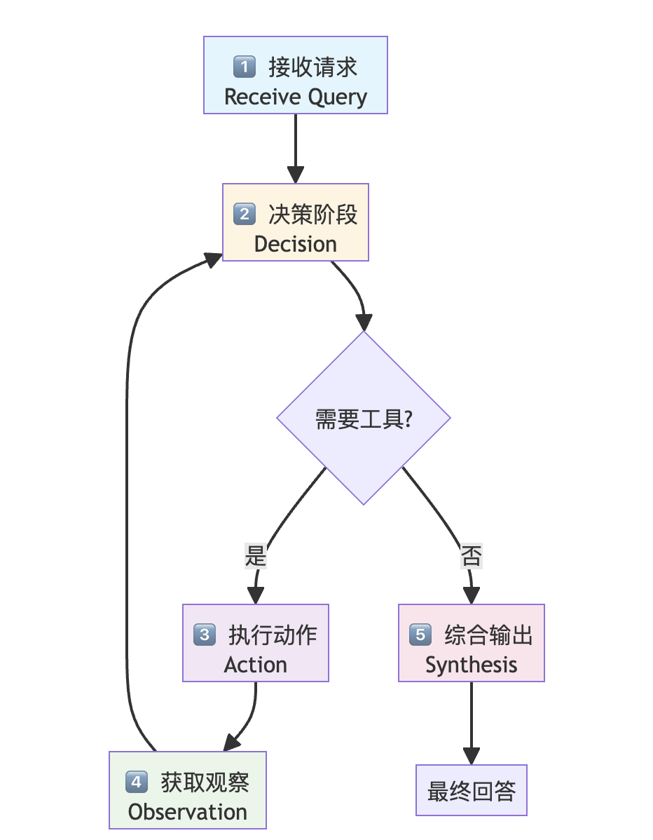 工具调用的过程遵循 "接收-决策-执行-观察-综合" 的循环: