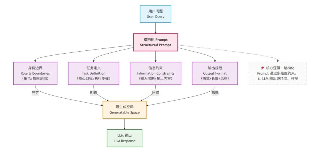 既然 Prompt 的本质是“约束生成空间”,那么它就不应该是随意拼接的字符串,而应该具备清晰、稳定、可复用的结构。