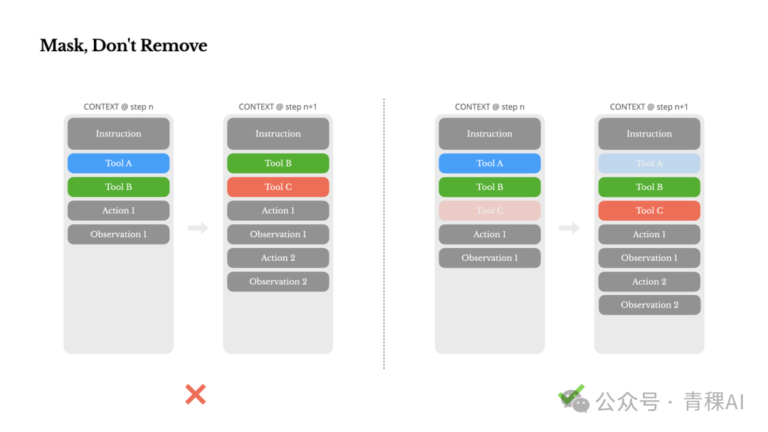 解决方案:Logit Masking (Constrained Decoding) 利用有限状态机管理当前状态下可用的工具,在 Decoding 阶段直接修改 Logits 分布,将不可用工具的概率置为 -\infty,而不是修改 Prompt 中的工具定义。