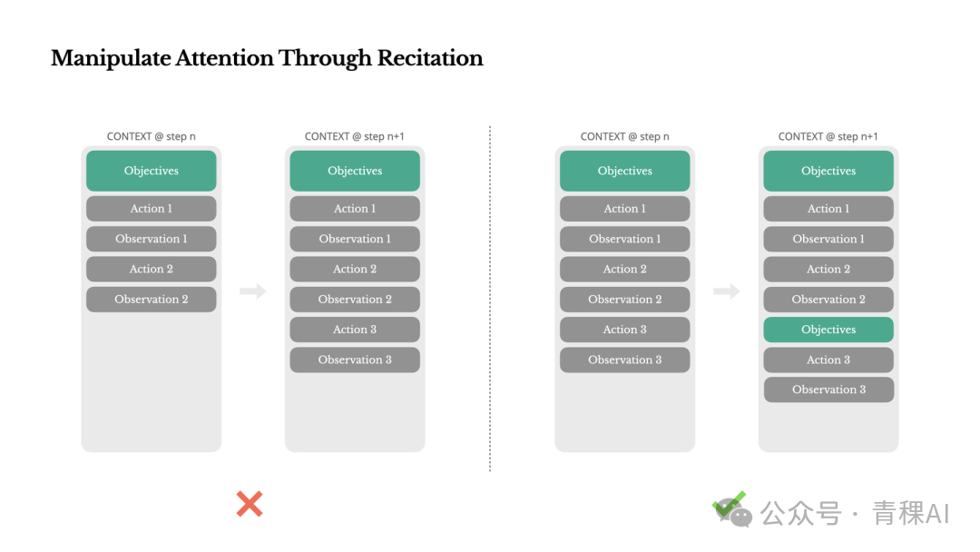 机制:Todo List Recitation。 Agent 维护一个 todo.md 文件,并在每一步更新它。这不仅仅是记录,更是一种 Attention Engineering。通过不断在 Context 末尾背诵当前进度和剩余目标,强行将 Global Plan 拉入模型的 最近注意力区域。