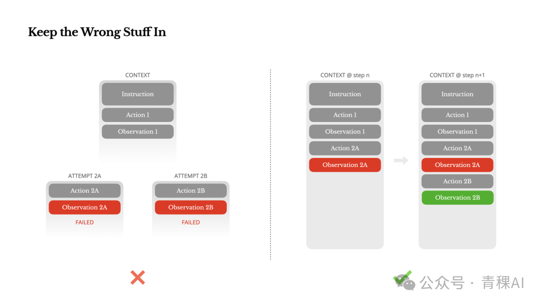 - • ✅ Manus 做法:保留错误的 Action 和报错的 Observation。