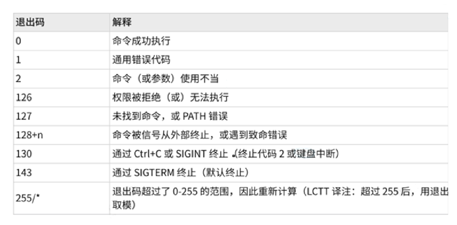退出码(退出状态)可以告诉我们最后一次执行的命令的状态。在命令结束以后,我们可以知道命令是成功完成的还是以错误结束的。其基本思想是,程序返回退出代码 0 时表示执行成功,没有问题。