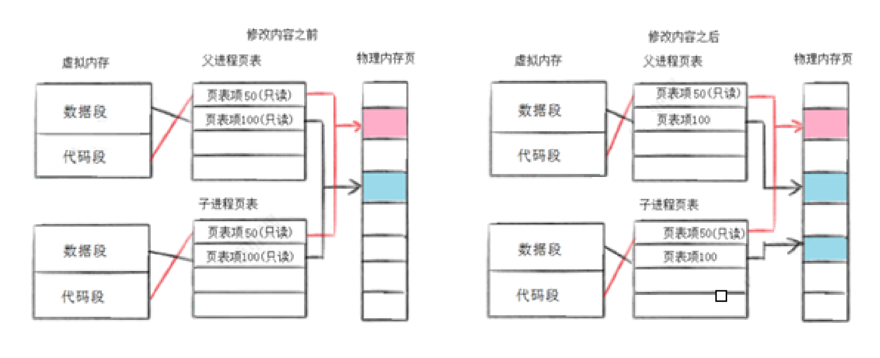 通常,父子代码共享,父子再不写入时,数据也是共享的,当任意一方试图写入,便以写时拷贝的方式各自一份副本。具体见下图: