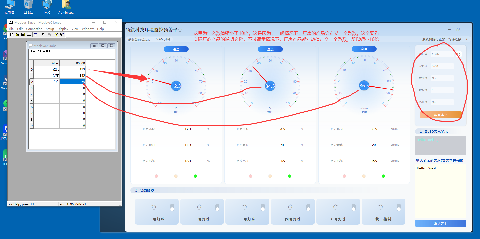 本文主要包含两部分内容:1) Modbus功能码03报文的解析说明,详细介绍了读取保持寄存器的请求和响应报文格式,包括事务标识符、协议标识符、功能码等字段的解析方法,并提供了示例报文;2) 基于Qt的串口监控系统实现,通过MonitorView类实现串口参数配置、设备连接、数据收发等功能,MainWindow类负责界面导航、线程管理和数据处理。系统可实时显示温度、湿度、亮度等传感器数据,并计算历史