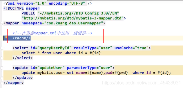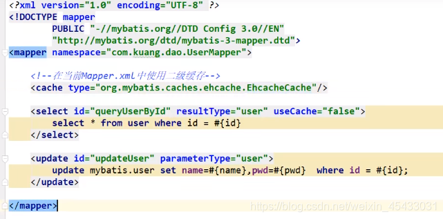 2.在mapper中指定使用我们的 Ehcache 缓存实现类