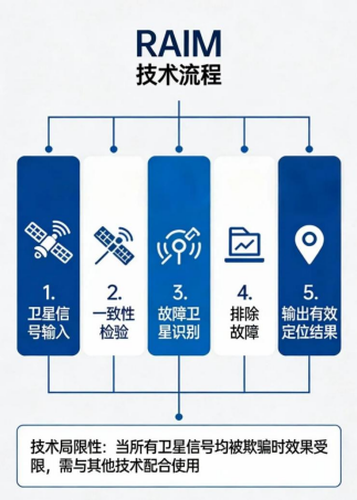这是一种低成本的算法级抗干扰技术,其核心原理是利用多颗卫星冗余观测值进行一致性检验,当某颗卫星信号存在异常(如受到欺骗干扰或多路径效应影响)时,RAIM能通过残差分析识别故障卫星并排除其影响,确保定位结果的有效性。但该技术在所有卫星信号均被欺骗时效果受限,需与其他技术配合使用。