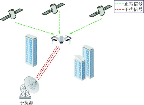 是一种常见的干扰方式,其原理是使用干扰机发射一个与导航信号频率重叠的干扰信号,且干扰信号功率远大于导航信号功率,从而使卫星导航接收机无法正常接收导航信号,导致接收机定位效果失效。