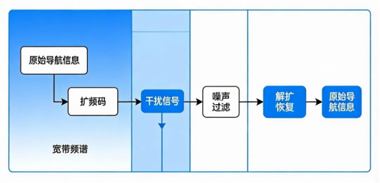 卫星导航信号本身采用直接序列扩频(DSSS)技术,将窄带导航信息扩展到宽带频谱上——干扰信号若未匹配扩频码,会被接收机视为噪声过滤;