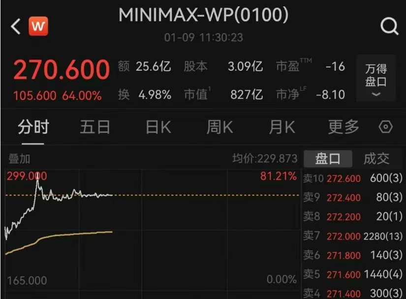 1 月 9 日,MiniMax 在港交所挂牌,开盘后股价一度暴涨超 80%,市值突破 900 亿港元。 即便回落后,市值仍稳定在 800 亿港元量级。