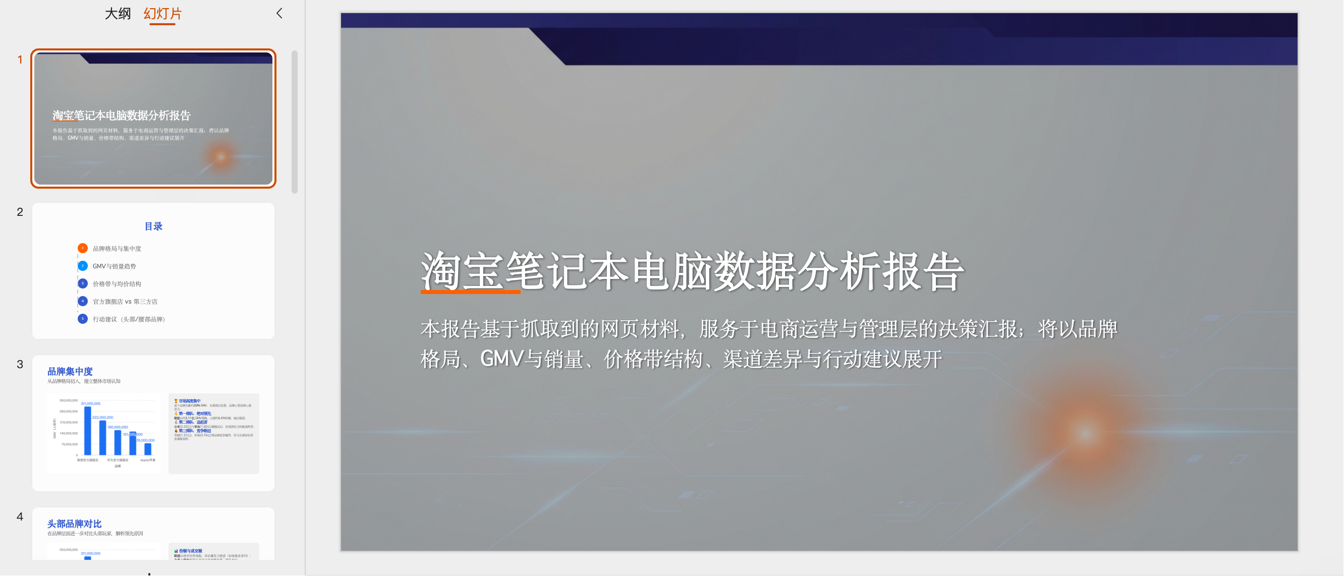 它支持将报告转换为PPT版本,生成的PPT除了图片外,其他都是可编辑的,虽然排版没那么花里胡哨,但结构清晰,我觉得改一改可以直接用于日常汇报。