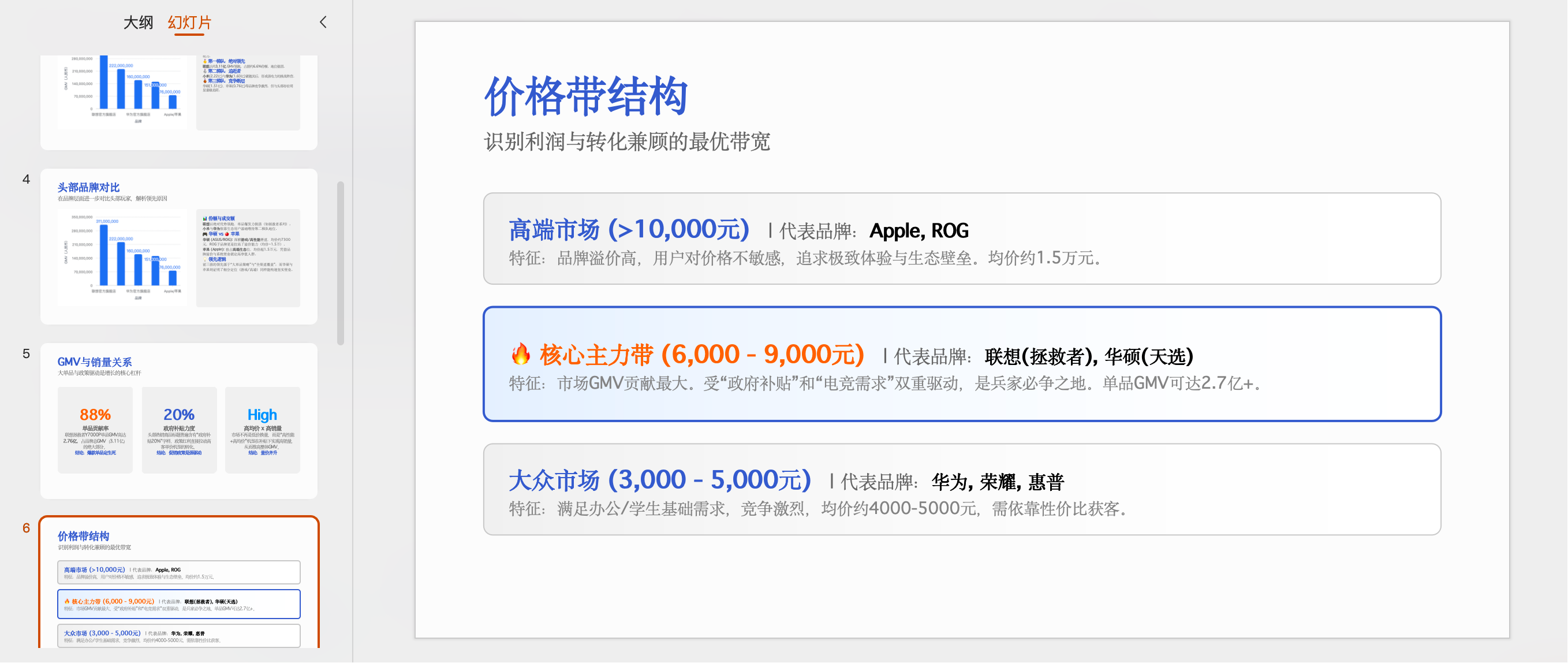 AnyGen则更加开放,你只需要通过简单的对话,它就会搜集各种开放的资料进行知识整合,输出结果,比如让它调研某个产品的市场行情,它就会搜罗-整合-输出,扔给你一份报告。