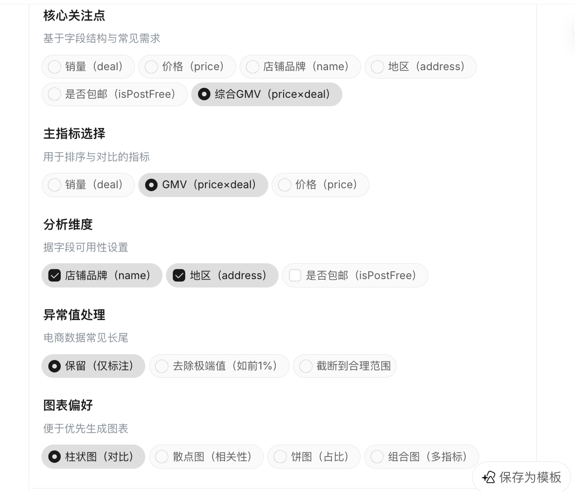 它还会提供可选配置项,让用户自己选择数据分析的关注点、主指标、分析维度、异常值处理、图表偏好等。