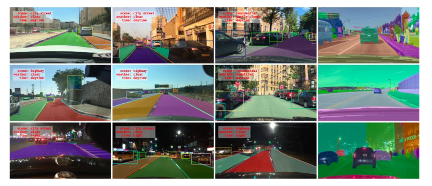 BAIR研究者在每个视频的第10秒采样关键帧,并为这些关键帧提供注释。它们被标记为几个类别:图像标记、道路对象边界框、可驾驶区域、车道标记线和全帧实例分割。这些注释有助于理解不同场景中数据和对象统计的多样性。