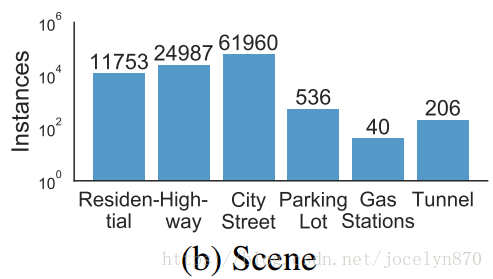 场景:住宅区、公路、城市街道、停车场、加油站、隧道6种场景,以城市街道为主。