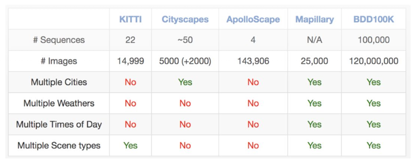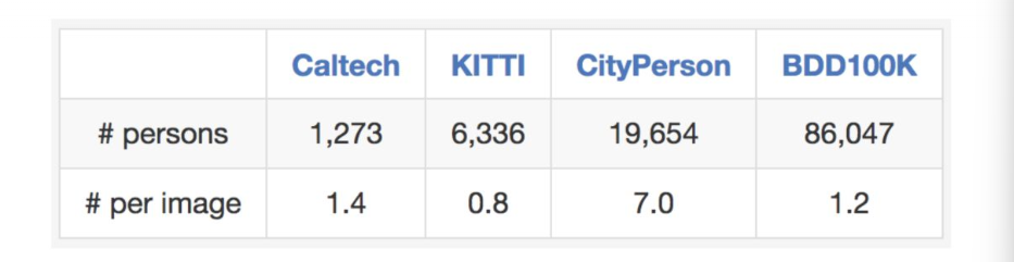 该数据集也适用于研究某些特定的领域。例如,若对检测和避开街道上的行人感兴趣,可以考虑研究该数据集,因为它包含的行人实例比以前的转嗯数据集还要多,如下表所示: