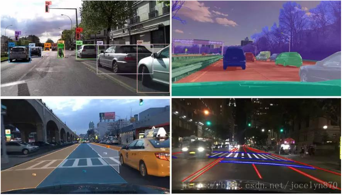 我们能否在某条路上驾驶取决于车道线、交通设备,以及与道路上其他对象的复杂互动。总之,理解哪块区域适合驾驶非常重要。为研究该问题,BAIR提供可驾驶区域的分割注释,如下图所示。