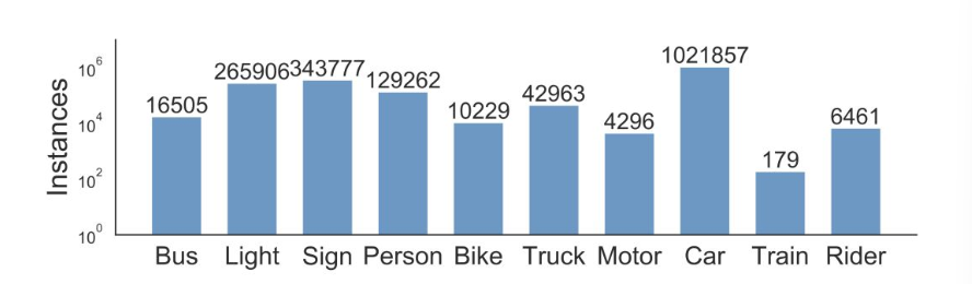 数据集中的GT框标签共有10个类别,分别为:Bus、Light、Sign、Person、Bike、Truck、Motor、Car、Train、Rider。总共约有184万个标定框,不同类型目标的数目统计如图1所示。