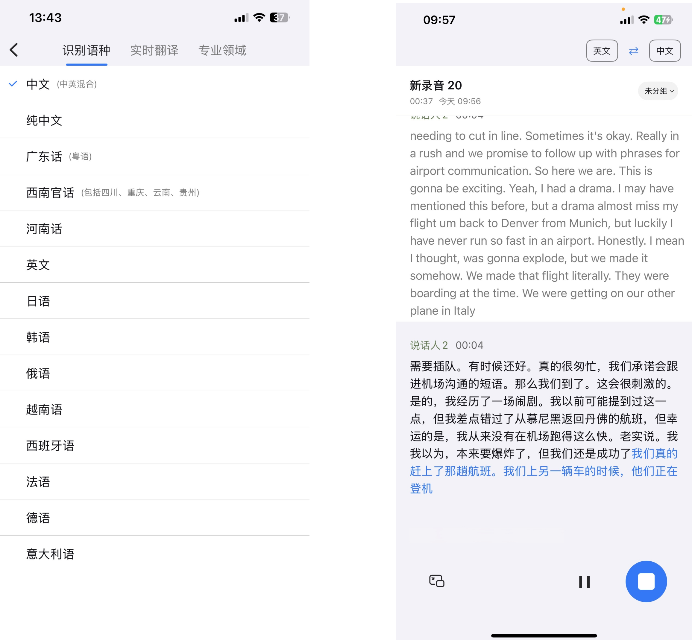 * 分析: 随身鹿近乎100%还原了对话内容,连重庆同事的语气词“哈”都精准记录。查阅其功能介绍后我才恍然大悟,其成功的秘诀在于开始录音前,可以选择特定的识别引擎。根据知识库信息,随身鹿明确支持“河南话”和“西南官话”等多种方言和语言。这种针对垂直领域的优化,使其在处理方言时,能够跳出普通话的框架,真正“听懂”说话人的意思。官方宣称其综合转写准确率高达98%,在这次方言测试中,它的表现确实名副其实。