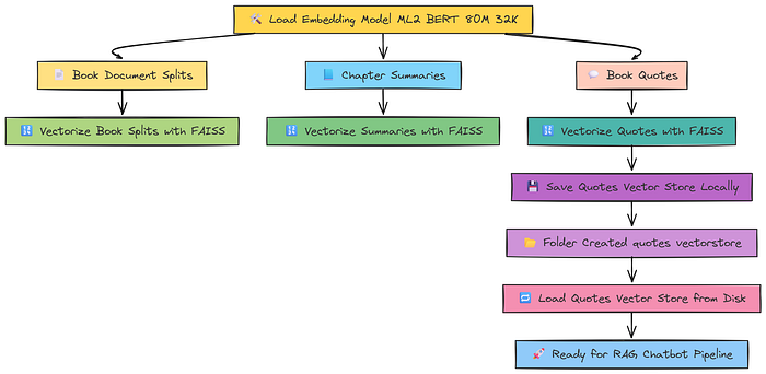 from langchain.vectorstores import FAISS# 使用嵌入模型,将文档切分后的内容存入FAISS向量数据库book_splits_vectorstore = FAISS.from_documents(document_splits, m2_bert_80M_32K)# 使用嵌入模型,将章节摘要存入FAISS向量数据库chapter_summaries_vectorstore = FAISS.from_documents(chapter_summaries, m2_bert_80M_32K)# 使用嵌入模型,将书籍引用语句存入FAISS向量数据库quotes_vectorstore = FAISS.from_documents(book_quotes_list, m2_bert_80M_32K)