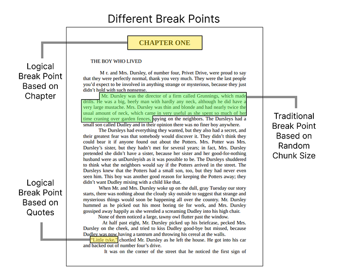 在我们的书籍案例中,引号(引用语句)是第二个重要的拆分点,因为引号通常包含了关键的总结性信息。而在财务文档中,重要的拆分点可能是表格或财务报表,因为它们包含了关键的数据。