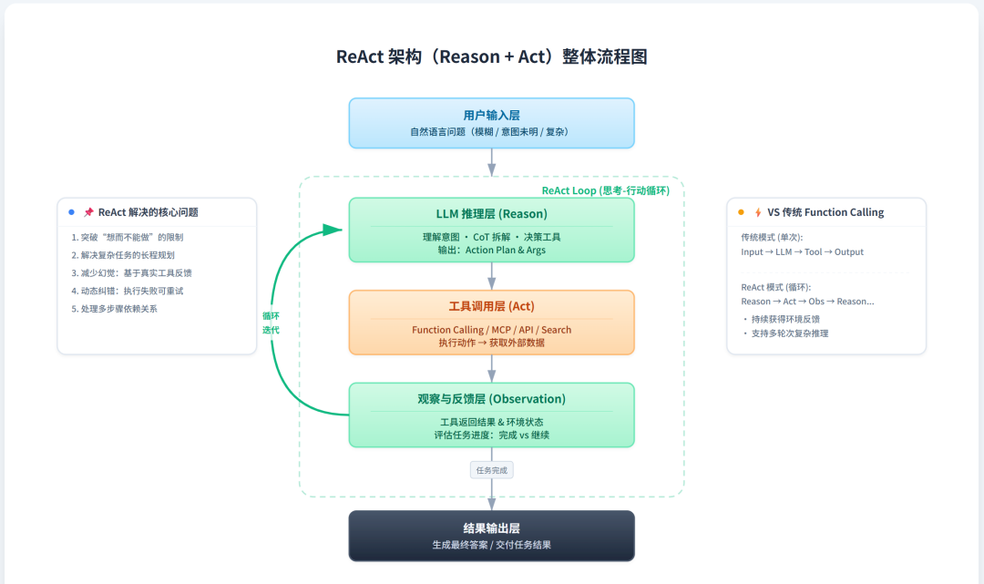 在 ReAct 框架下,Agent重复执行**思考(Thought)→行动(Action)→观察(Observation)**的循环,直到产生最终答案。