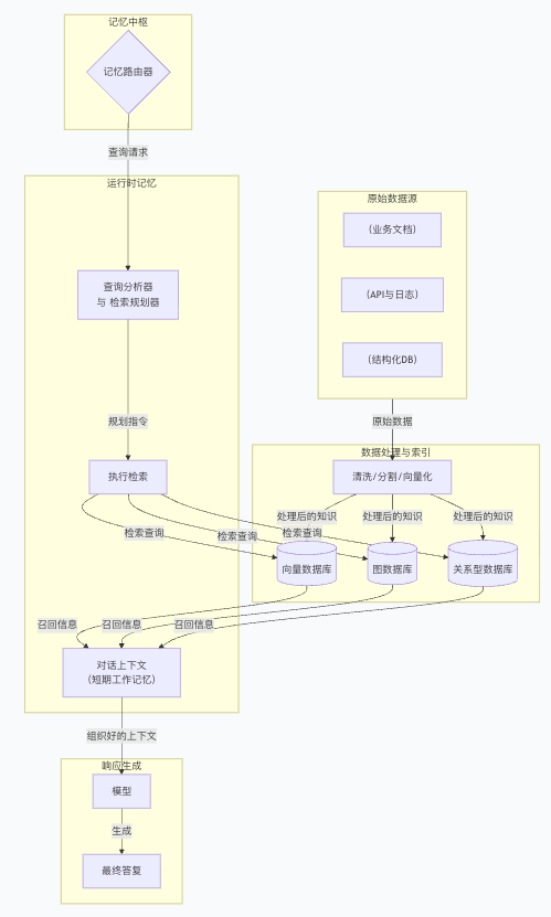 包括短期记忆(对话上下文、近期交互)和长期记忆(知识库、历史数据、个人偏好等)。记忆层用于存储和检索与任务相关的信息,以支持多轮交互和知识补充: