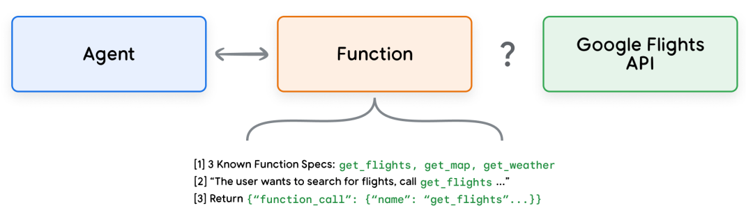 与扩展对比的主要差别在于,扩展在智能体端执行调用外部服务,而函数在客户端执行。这意味着即使模型选择了某个函数,实际的 API 调用可能会在另一个服务层面完成。